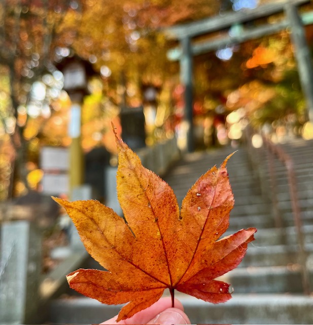 【写真下】参道で拾った小さな紅葉の可愛らしさに、ついパシャリ♪